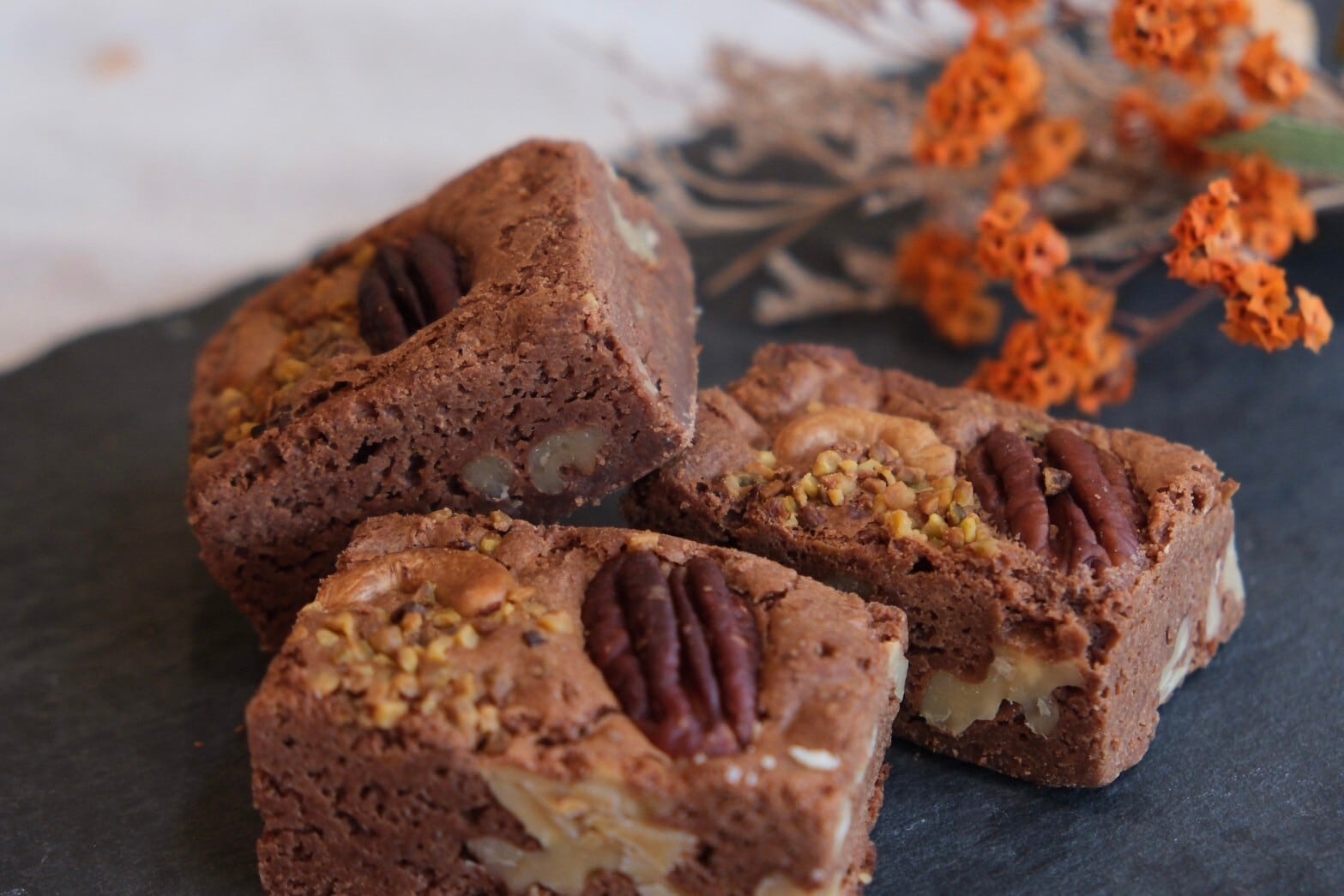 砂糖・バター・卵・クルミ・チョコレート・小麦粉・塩・ピーカンナッツ・カシューナッツ・ピスタチオ・コリアンダー・シナモン